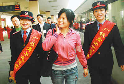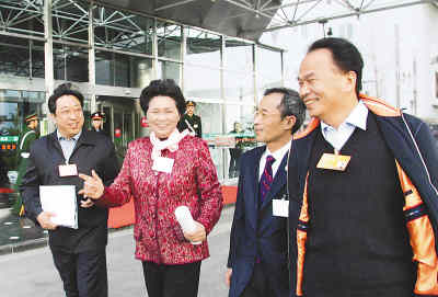 3月1日,全國人大代表文花枝(中)在長沙火車站受到青年的歡迎。楊抒懷