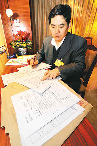 3月1日,全國政協(xié)委員湯建人在駐地修改提案,他準備了22個提案。新華社記者