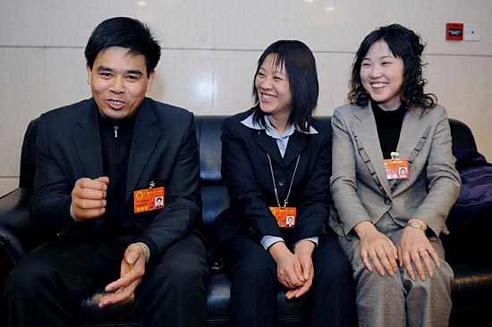“你們帶來了什么建議?”“我主要關(guān)注的是農(nóng)民工待遇問題”“我想在農(nóng)民工與城市融合方面提些建議”……朱雪芹、胡小燕和康厚明,這三名分別來自上海、廣東和重慶的新任農(nóng)民工全國人大代表第一次坐在一起,共同商討如何更好地履行職責(zé)、反映他們所代表的一億多農(nóng)民工的心聲。 雖然素昧平生,但共同的身份和使命,使本屆全國人代會首次選舉產(chǎn)生的僅有的三名農(nóng)民工代表走到一起。3日,在朱雪芹的駐地,三位代表聚到一起,“履職”感受和農(nóng)民工相關(guān)議題成了討論的核心話題。 “我這兩天主要是學(xué)習(xí)相關(guān)知識和法律法規(guī),醞釀最終的建議!