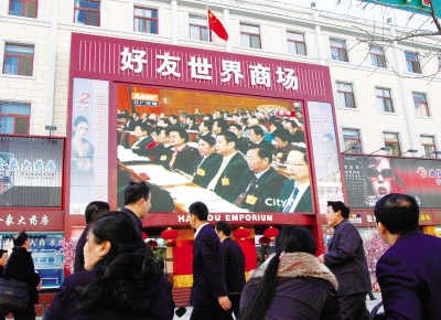 兩會(huì)成為舉世注目的焦點(diǎn)。圖為在北京繁華的王府井金街,巨幅電視墻上轉(zhuǎn)播兩會(huì)實(shí)況吸引了過往行人駐足觀看。