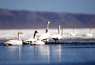 | 青海湖越冬大天鵝數(shù)量創(chuàng)歷史最高紀錄,這是在青海湖冰面上休息的大天鵝(2008年3月1日攝)。新華社記者 嘎瑪