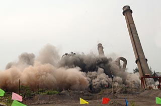 | 2007年9月5日,山東炸響拆除小火電“全國第一爆”。山東省微山湖煤電公司8臺燃煤小火電機(jī)組的主廠房和兩座煙囪被爆破拆除。新華社記者