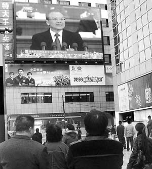 | 圖為行人在王府井步行街觀(guān)看大會(huì)直播。余倩 攝 |