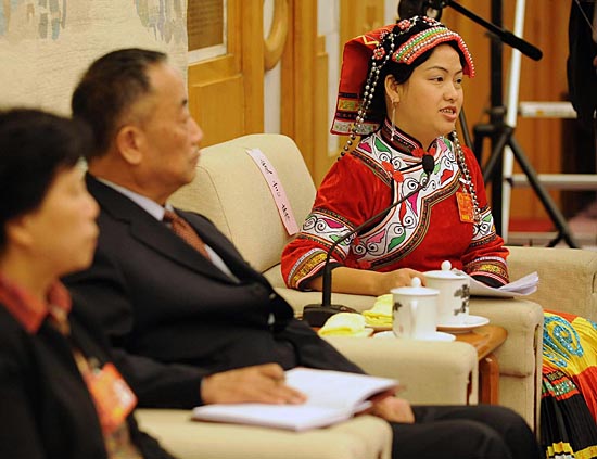 全國(guó)人大代表陳萍(右,彝族)在發(fā)言中表達(dá)了五個(gè)期盼:一盼農(nóng)村基礎(chǔ)建設(shè)力度加大;二盼退耕還林政策更加深入;三盼沼氣池建設(shè)力度加大;四盼有更多的困難戶住上寬敞明亮的房子;五盼農(nóng)村孩子特別是少數(shù)民族孩子有更多接受高等教育的機(jī)會(huì)。