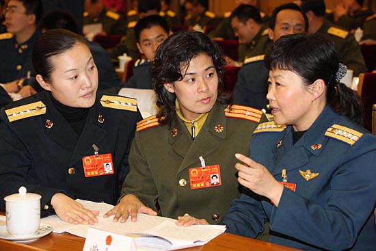 在十一屆全國人大解放軍代表團的代表中,有22名女代表,分別來自戰(zhàn)備訓練、國防科研、醫(yī)療衛(wèi)生、文藝體育等多個戰(zhàn)線。她們在國防和軍隊建設中發(fā)揮了重要作用,在人代會上忠實履行著自己的職責。