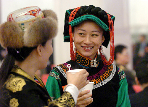 2008年3月10日上午9時(shí),第十一屆全國人民代表大會第一次會議在人民大會堂舉行第三次全體會議,聽取最高人民法院院長肖揚(yáng)作最高人民法院工作報(bào)告;聽取最高人民檢察院檢察長賈春旺作最高人民檢察院工作報(bào)告。圖為大會開始前兩位代表在交談。