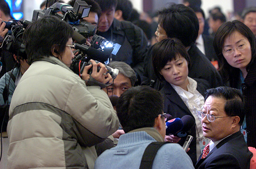 2008年3月10日上午9時(shí),第十一屆全國人民代表大會第一次會議在人民大會堂舉行第三次全體會議,聽取最高人民法院院長肖揚(yáng)作最高人民法院工作報(bào)告;聽取最高人民檢察院檢察長賈春旺作最高人民檢察院工作報(bào)告。圖為大會開始前記者采訪人大代表。