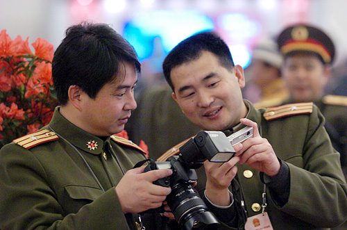 2008年3月10日上午9時(shí),第十一屆全國人民代表大會第一次會議在人民大會堂舉行第三次全體會議,聽取最高人民法院院長肖揚(yáng)作最高人民法院工作報(bào)告;聽取最高人民檢察院檢察長賈春旺作最高人民檢察院工作報(bào)告。圖為兩位解放軍代表團(tuán)工作人員在查看照片。
