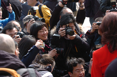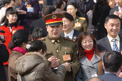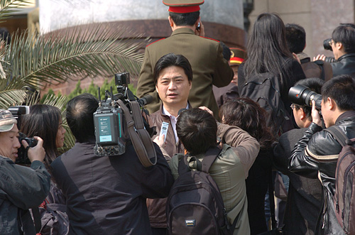 3月14日,中國人民政治協(xié)商會議第十一屆全國委員會第一次會議在北京人民大會堂舉行閉幕會。圖為當(dāng)日在大會堂外的廣場上被記者“圍堵”采訪的政協(xié)委員。