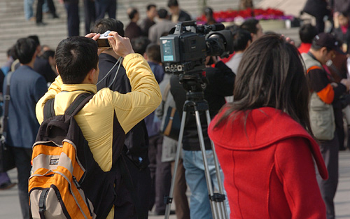 3月14日,中國人民政治協(xié)商會議第十一屆全國委員會第一次會議在北京人民大會堂舉行閉幕會。圖為當日在大會堂外的廣場上等候采訪的媒體記者。