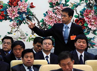 全國(guó)人大代表、河北秦皇島市代市長(zhǎng)朱浩文(后立者)說(shuō),秦皇島市是沿海旅游城市,應(yīng)借助奧運(yùn)會(huì)帶來(lái)的機(jī)會(huì),做大做強(qiáng)旅游業(yè)等傳統(tǒng)優(yōu)勢(shì)產(chǎn)業(yè),加速產(chǎn)業(yè)換代升級(jí),落實(shí)“綠色奧運(yùn)、科技奧運(yùn)、人文奧運(yùn)”的理念,發(fā)展“高科技、低能耗、無(wú)污染”產(chǎn)業(yè),促進(jìn)經(jīng)濟(jì)由粗放擴(kuò)張型向精細(xì)集約型轉(zhuǎn)變。