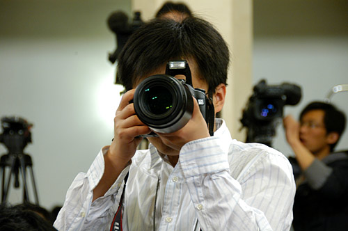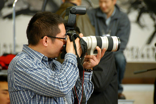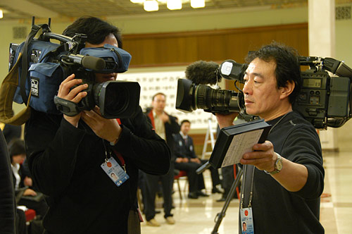 3月18日上午十一屆全國人大一次會議閉幕后,國務(wù)院總理溫家寶在人民大會堂三樓中央大廳與采訪十一屆全國人大一次會議的中外記者見面并回答記者提出的問題。圖為記者在調(diào)試設(shè)備。