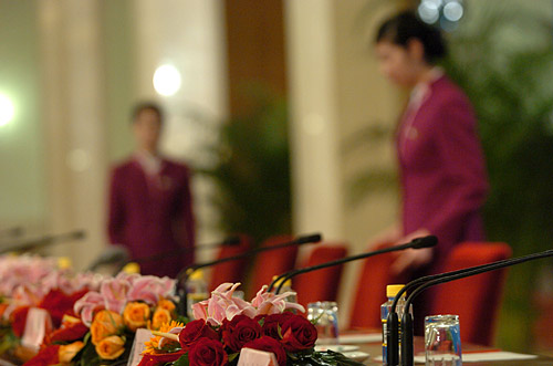3月18日上午十一屆全國人大一次會議閉幕后,國務(wù)院總理溫家寶在人民大會堂三樓中央大廳與采訪十一屆全國人大一次會議的中外記者見面并回答記者提出的問題。圖為工作人員在作準備。