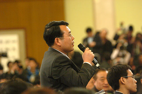 3月18日,國務(wù)院總理溫家寶和副總理李克強(qiáng)、回良玉、張德江、王岐山在北京人民大會堂與中外記者見面,并回答記者提問。圖為新華社記者在提問。