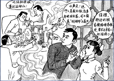 隨著人們對健康意識的普遍增強(qiáng),對餐廳“禁煙”的要求也愈加強(qiáng)烈,2008年國家提出了“無煙奧運(yùn)”的概念,規(guī)定相關(guān)的餐廳等場所要“禁煙”。但是一些餐廳首先考慮的是利潤,擔(dān)心餐廳控?zé)煏绊憼I業(yè)額,也有些食客固守吃飯抽煙的習(xí)慣不想改掉,使“無煙餐廳”至今尚未全面“開花結(jié)果”。看來,“餐廳等場所禁煙”,除了有關(guān)部門檢查監(jiān)督外,某些煙民也應(yīng)轉(zhuǎn)變老習(xí)慣,養(yǎng)成文明行為才行。