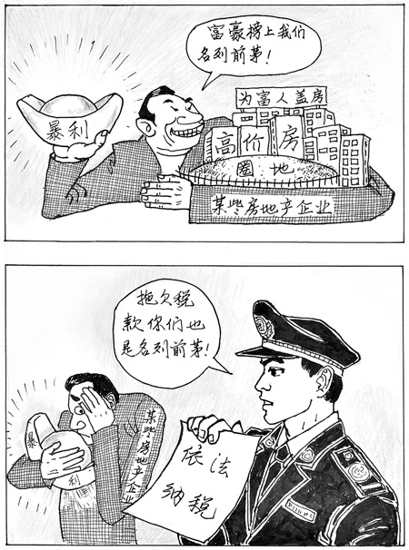一方面大肆圈地、推高房?jī)r(jià)、牟取暴利,另一方面卻欠稅不繳,房地產(chǎn)企業(yè)成為欠稅大戶在全國各地并不鮮見,例如北京市地稅局日前依法公布了京城63家欠稅企業(yè)名單,其中房地產(chǎn)企業(yè)占一半以上。 用拖欠稅款的手段,以達(dá)到繼續(xù)牟取暴利目的,其中反映的應(yīng)該不僅僅是房地產(chǎn)企業(yè)缺乏納稅意識(shí)的問題。在老百姓眼里富得“冒油”的房地產(chǎn)企業(yè),為何能成為欠稅大戶?相關(guān)稅務(wù)征管環(huán)節(jié)有無漏洞和責(zé)任?在依法處理這些欠稅大戶的同時(shí),稅務(wù)征管工作是否也應(yīng)有所加強(qiáng)。 |