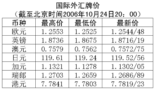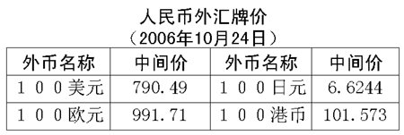根據(jù)中國人民銀行授權(quán)中國外匯交易中心發(fā)布的公告,2006年10月24日銀行間外匯市場美元等交易貨幣對人民幣匯率的中間價(jià)為:1美元兌人民幣7.9049元,1歐元兌人民幣9.9171元,100日元兌人民幣6.6244元,1港元兌人民幣1.01573元,1英鎊兌人民幣14.8032元。