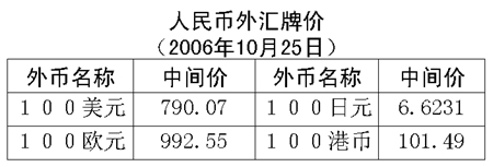 根據(jù)中國人民銀行授權(quán)中國外匯交易中心發(fā)布的公告,2006年10月25日銀行間外匯市場美元等交易貨幣對人民幣匯率的中間價為:1美元兌人民幣7.9007元,1歐元兌人民幣9.9255元,100日元兌人民幣6.6231元,1港元兌人民幣1.01490元,1英鎊兌人民幣14.8036元。