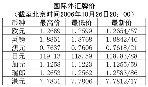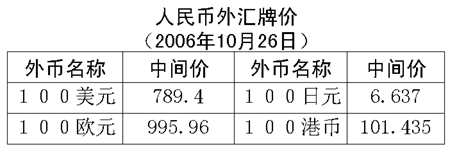 根據(jù)中國人民銀行授權(quán)中國外匯交易中心發(fā)布的公告,2006年10月26日銀行間外匯市場(chǎng)美元等交易貨幣對(duì)人民幣匯率的中間價(jià)為:1美元兌人民幣7.8940元,1歐元兌人民幣9.9596元,100日元兌人民幣6.6370元,1港元兌人民幣1.01435元,1英鎊兌人民幣14.8356元。