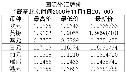 中國人民銀行授權(quán)中國外匯交易中心公布,2006年11月1日銀行間外匯市場(chǎng)美元等交易貨幣對(duì)人民幣匯率的中間價(jià)為:1美元對(duì)人民幣7.8720元,1歐元對(duì)人民幣10.0485元,100日元對(duì)人民幣6.7368元,1港元對(duì)人民幣1.01223元,1英鎊對(duì)人民幣15.0200元。
