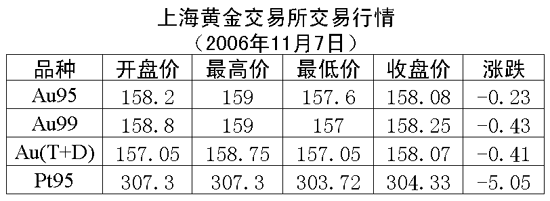 7日,上海黃金交易所黃金Au99.95收盤于158.08元/克,下跌0.23元/克,共成交2198公斤;黃金Au99.99收盤于158.25元/克,下跌0.43元/克,共成交621.40公斤;鉑金Pt99.95收盤于304.33元/克,下跌5.05元/克,共成交78公斤;黃金Au(T+D)延期交易品種收盤于158.07元/克,下跌0.41元/克,共成交3216公斤。