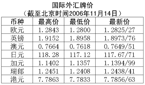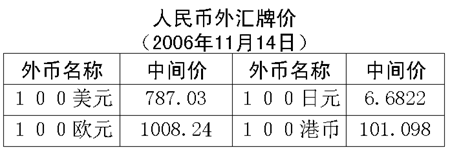 根據(jù)中國(guó)人民銀行授權(quán)中國(guó)外匯交易中心發(fā)布的公告,2006年11月14日銀行間外匯市場(chǎng)美元等交易貨幣對(duì)人民幣匯率的中間價(jià)為:1美元兌人民幣7.8703元,1歐元兌人民幣10.0824元,100日元兌人民幣6.6822元,1港幣兌人民幣1.01098元,1英鎊兌人民幣14.9739元。