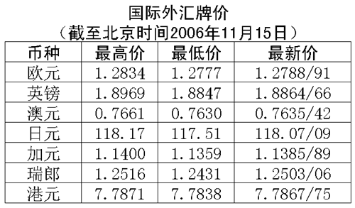 根據(jù)中國人民銀行授權(quán)中國外匯交易中心發(fā)布的公告,2006年11月15日銀行間外匯市場美元等交易貨幣對人民幣匯率的中間價(jià)為:1美元兌人民幣7.8715元,1歐元兌人民幣10.0839元,100日元兌人民幣6.6895元,1港幣兌人民幣1.01105元,1英鎊兌人民幣14.9251元。
