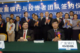 16日20時左右,廣東發(fā)展銀行與美國花旗銀行牽頭組織的國內外投資者團隊在廣州簽署了戰(zhàn)略投資與合作協(xié)議;ㄆ旒瘓F與IBM信貸、中國人壽、國家電網(wǎng)、中信信托、普華投資等國內外企業(yè)組成的投資者團隊出資242.67億元,認購重組后的廣發(fā)行85.5888%的股份。
