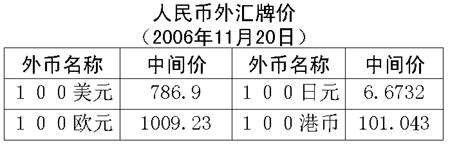 根據(jù)中國人民銀行授權(quán)中國外匯交易中心發(fā)布的公告,2006年11月20日銀行間外匯市場美元等交易貨幣對人民幣匯率的中間價為:1美元兌人民幣7.8690元,1歐元兌人民幣10.0923元,100日元兌人民幣6.6732元,1港幣兌人民幣1.01043元,1英鎊兌人民幣14.9062元。