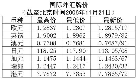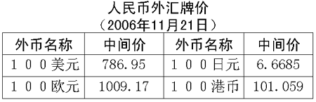 根據(jù)中國人民銀行授權(quán)中國外匯交易中心發(fā)布的公告,2006年11月21日銀行間外匯市場美元等交易貨幣對人民幣匯率的中間價(jià)為:1美元兌人民幣7.8695元,1歐元兌人民幣10.0917元,100日元兌人民幣6.6685元,1港幣兌人民幣1.01059元,1英鎊兌人民幣14.9383元。