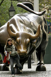 一名女子在美國紐約證券交易所附近的銅奔牛雕像前留影。經(jīng)濟參考報資料圖片
