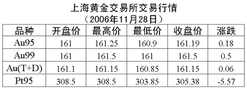 28日,上海黃金交易所黃金Au99.95收盤于161.19元/克,上漲0.18元/克,共成交1924公斤;黃金Au99.99收盤于161.50元/克,上漲0.50元/克,共成交875公斤;鉑金Pt99.95收盤于305.38元/克,下跌5.57元/克,共成交270公斤;黃金Au(T+D)延期交易品種收盤于161.15元/克,上漲0.06元/克,共成交2988公斤。