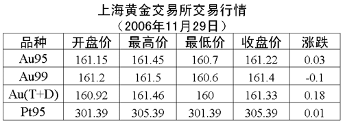 29日,上海黃金交易所黃金Au99.95收盤于161.22元/克,上漲0.03元/克,共成交2492公斤;黃金Au99.99收盤于161.40元/克,下跌0.10元/克,共成交696.60公斤;鉑金Pt99.95收盤于305.39元/克,上漲0.10元/克,共成交146公斤;黃金Au(T+D)延期交易品種收盤于161.33元/克,上漲0.18元/克,共成交2522公斤。