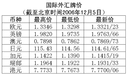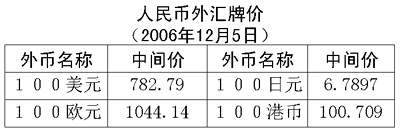 根據(jù)中國(guó)人民銀行授權(quán)中國(guó)外匯交易中心發(fā)布的公告,2006年12月5日銀行間外匯市場(chǎng)美元等交易貨幣對(duì)人民幣匯率的中間價(jià)為:1美元兌人民幣7.8279元,1歐元兌人民幣10.4414元,100日元兌人民幣6.7897元,1港幣兌人民幣1.00709元,1英鎊兌人民幣15.4885元。