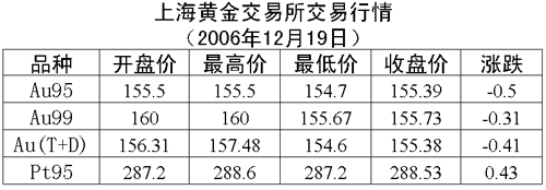19日,上海黃金交易所黃金Au99.95收盤于155.39元/克,下跌0.5元/克,共成交2490公斤;黃金Au99.99收盤于155.73元/克,下跌0.31元/克,共成交513.40公斤;鉑金Pt99.95收盤于288.53元/克,上漲0.43元/克,共成交156公斤。黃金Au(T+D)延期交易品種收盤于155.38元/克,下跌0.41元/克,共成交4280公斤。