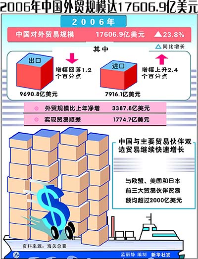 海關(guān)總署10日公布,2006年我國對外貿(mào)易規(guī)模高達17606.9億美元,比2005年增長23.8%,我國對外貿(mào)易發(fā)展增速已經(jīng)連續(xù)5年保持在20%以上。2006年我國外貿(mào)比2005年凈增加3387.8億美元,超過1998年全年的進出口規(guī)模。2006年我外貿(mào)出口9690.8億美元,增長27.2%,同比回落1.2個百分點;進口7916.1億美元,增長20%,同比上升2.4個百分點。