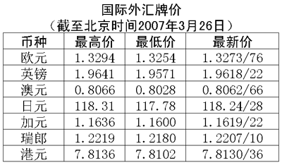 根據(jù)中國(guó)人民銀行授權(quán)中國(guó)外匯交易中心發(fā)布的公告,2007年3月26日銀行間外匯市場(chǎng)美元等交易貨幣對(duì)人民幣匯率的中間價(jià)為:1美元兌人民幣7.7393元,1歐元兌人民幣10.2711元,100日元兌人民幣6.5637元,1港幣兌人民幣0.99063元,1英鎊兌人民幣15.1691元。