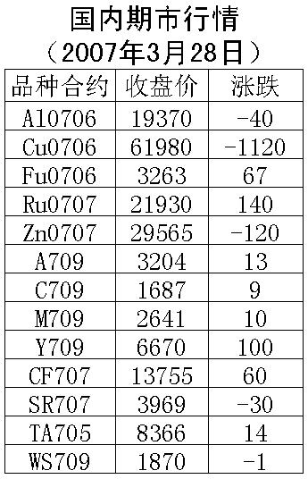3月28日國內(nèi)期貨市場金、農(nóng)產(chǎn)品下跌,能源價格上漲。滬銅706合約下跌1120元/噸,收盤61980元/噸,支撐60000元一線,上漲壓力65000元一線。滬鋁706合約下跌40元/噸,收盤19370元/噸,支撐19200元一線,上漲壓力19800元一線。