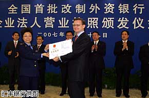 渣打、匯豐、花旗和東亞四家外資銀行29日獲得上海市工商行政管理局頒發(fā)的法人銀行營業(yè)執(zhí)照,這標志著全國首批經(jīng)過改制的外資銀行正式取得中國企業(yè)法人地位。記者同時獲悉,這四家銀行預(yù)計下周將正式開業(yè)。