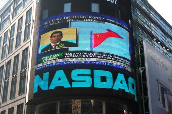 4月3日,美國紐約時報廣場的納斯達(dá)克大型電視屏幕直播開市盛況和有關(guān)中國的畫面。當(dāng)日紐約時間上午九點(diǎn)半(北京時間當(dāng)晚九點(diǎn)半),該交易所在中國北京人民大會堂“遙控”舉行開市儀式,以慶祝越來越多的中國公司在該交易所掛牌上市。