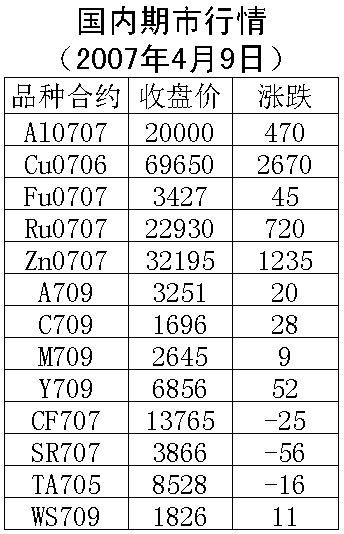 4月9日國(guó)內(nèi)期貨市場(chǎng)白糖下跌,金屬、能源、農(nóng)產(chǎn)品價(jià)格全部飄紅。倫敦、美國(guó)市場(chǎng)上周五因復(fù)活節(jié)休市。滬銅706合約周一上漲2670元/噸,收盤(pán)69650元/噸,支撐價(jià)位68000元一線(xiàn),上漲壓力71500元一線(xiàn)。滬鋁706合約周一上漲360元/噸,收盤(pán)19860元/噸,支撐19600元一線(xiàn),上漲壓力20300元一線(xiàn)。