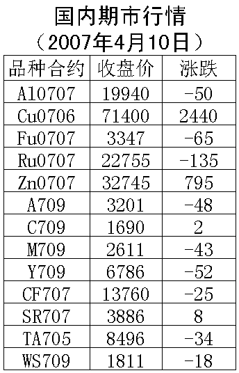 4月10日國內(nèi)期貨市場農(nóng)產(chǎn)品、能源價格下跌,銅、白糖價格上漲。滬銅706合約周二上漲2440元/噸,收盤71400元/噸,支撐69000元一線,上漲壓力71500元一線。滬鋁706合約周二下跌50元/噸,收盤19800元/噸,支撐19400元一線,上漲壓力20300元一線。