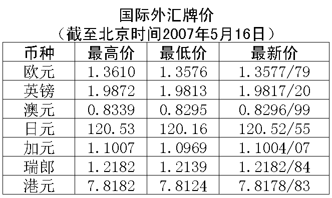 根據(jù)中國人民銀行授權(quán)中國外匯交易中心發(fā)布的公告,2007年5月15日銀行間外匯市場美元等交易貨幣對人民幣匯率的中間價為:1美元兌人民幣7.6948元,1歐元兌人民幣10.4203元,100日元兌人民幣6.3844元,1港幣兌人民幣0.98524元,1英鎊兌人民幣15.2272元。