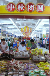 南京大多月餅不漲價。9月6日,幾位顧客正在一家超市中選購月餅。新華社記者:楊磊