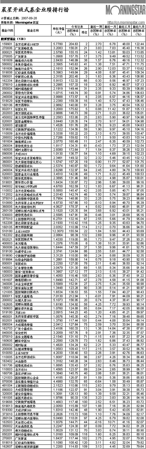 晨星開(kāi)放式基金業(yè)績(jī)排行榜[2007-09-28]