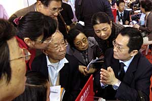 | 一家銀行的工作人員(右一)在教市民理財(cái)。新華社記者 孫參