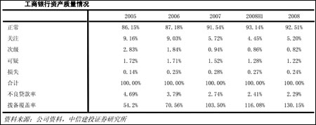 工行2008年不良貸款繼續(xù)雙降,年末不良貸款余額1044.82億元,較2008年初下降了72.92億元,不良貸款率較年初下降0.46%個(gè)百分點(diǎn),撥備覆蓋率(不計(jì)稅后利潤(rùn)中計(jì)提的一般準(zhǔn)備)達(dá)到130.15%,工行的信貸資產(chǎn)配置比較穩(wěn)健,基礎(chǔ)設(shè)施、公用事業(yè)等低風(fēng)險(xiǎn)政府背景項(xiàng)目貸款比重較高,預(yù)計(jì)其資產(chǎn)質(zhì)量在2009年和2010年有望保持穩(wěn)定。