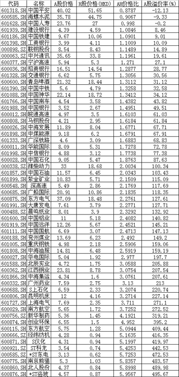 4月2日AH股價格對比