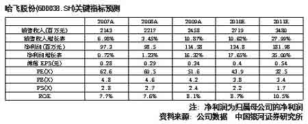 哈飛股份穩(wěn)健的業(yè)績增長,引起了市場的廣泛關注。多家機構(gòu)發(fā)布報告指出,該公司未來存在廣闊的發(fā)展空間,看好中長期前景。 哈飛股份發(fā)布的年報顯示,該公司2008年實現(xiàn)營業(yè)收入22.18億元,同比增長3.44%;營業(yè)利潤1.10億元,同比增長5.36%;歸屬于上市公司股東的凈利潤9,859萬元,同比增長1.23%;歸屬于上市公司股東的扣除非經(jīng)常性損益后的凈利潤1.01億元,同比增長3.01%;報告期末每股凈資產(chǎn)為3.84元,比年初增加0.19元,實現(xiàn)每股收益0.29元。 銀河證券認為,公司的營業(yè)收入同比增長3.44%,呈現(xiàn)平穩(wěn)增長的態(tài)勢。由于公司的主要收入來源是航空產(chǎn)品,在沒有新型號推出的情況下,客戶需求難以出現(xiàn)大幅增長。因此銀河證券預計未來一兩年,公司的業(yè)務仍將保持平穩(wěn)增長。航空產(chǎn)品的大幅增長可能在2011年以后,主要驅(qū)動因素包括新型號產(chǎn)品的推出,和民用直升機的有效需求被激發(fā)。 2009年1月,哈飛等企業(yè)與空中客車中國公司《哈爾濱哈飛空客復合材料制造中心有限公司合資合同》,雙方將在哈爾濱建設復合材料飛機零部件制造中心,2009年設立合資公司,為空中客車A350XWB飛機項目生產(chǎn)主要零部件。哈飛集團和哈飛股份將擁有50%股權。制造中心將于2009年內(nèi)投產(chǎn)。 哈飛在復合材料領域具有較強的技術,在國內(nèi)處于前列,此次與空客的合作開拓了公司的國際轉(zhuǎn)包業(yè)務,形成新的利潤增長點,還有利于公司未來在大飛機制造領域占據(jù)重要地位。 根據(jù)上市公司的產(chǎn)業(yè)布局,2011年后航空產(chǎn)品和轉(zhuǎn)包業(yè)務都將新的發(fā)展機遇,從而推動公司業(yè)績實現(xiàn)大幅增長。預計2009至2011年每股收益分別為0.34元和0.40元和0.54元。公司目前市盈率偏高,不過考慮到公司未來有收購中航直升機公司優(yōu)質(zhì)資產(chǎn)的潛力,銀河證券給予公司“謹慎推薦”的評級。 |