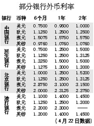 在所有的理財(cái)方式中,儲(chǔ)蓄存款被認(rèn)為是最為安全、保守的一種。不少人誤以為各個(gè)銀行的外幣存款利率是一致的,其實(shí)不然,外幣存款利率在不同的銀行間是有差異的。 近期,由于國(guó)際金融市場(chǎng)利率持續(xù)下降,不少銀行下調(diào)了小額(300萬(wàn)美元以下)外幣存款的利率。例如,4月11日,工商銀行調(diào)整境內(nèi)美元、港幣、英鎊、加元小額存款利率;建設(shè)銀行4月10日起調(diào)整境內(nèi)美元存款利率;此外,農(nóng)行于3月26日下調(diào)了英鎊、澳元、加元、新加坡元、瑞士法郎5種外幣存款利率;中國(guó)銀行于3月25日下調(diào)英鎊、澳元的外幣存款利率。 記者了解到,利率下調(diào)后,在某些幣種上,各銀行間的存款利率差異仍然很大。以美元為例,有的銀行二年期的存款利率為1.00%,有的為1.50%,而北京銀行的二年期美元存款利率則為1.52%。澳元方面,差異就更為明顯,北京銀行一年期的澳元存款利率為3.10%,遠(yuǎn)遠(yuǎn)高于其他銀行的1.50%。英鎊方面,北京銀行和深圳發(fā)展銀行的一年期英鎊存款利率為2.3125%,也高于1.25%左右的平均利率水平。